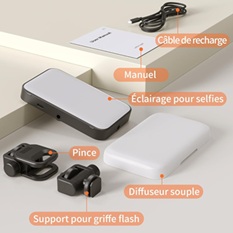 Grande compatibilité : La Lumière d'appoint est équipée de doubles trous de vis, de supports intégrés, d'une adsorption magnétique, d'un cache pour lumière douce, d'un port griffe et de clips. Portable, elle offre également une large compatibilité avec les appareils.